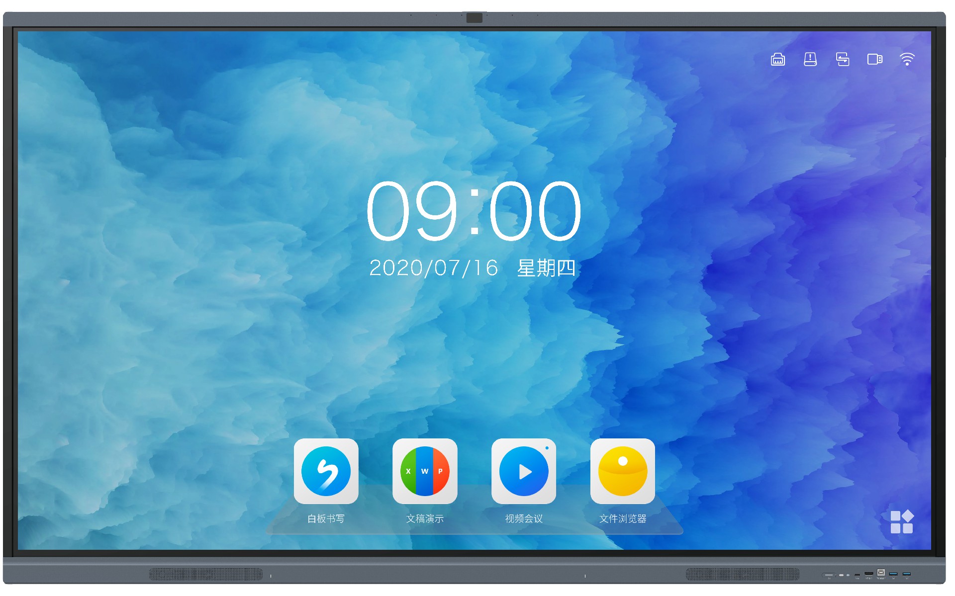 4.整機支持超級任務欄,功能包括:結束會議,打開應用,任務視圖,主頁,設置,網絡狀態,時間/日歷,觸控精靈菜單入口。通過底部觸控上劃調出超級任務欄,并且在未操作時可自動隱藏;前臺應用全屏運行,支持通過超級任務欄打開另一應用進行分屏展示。